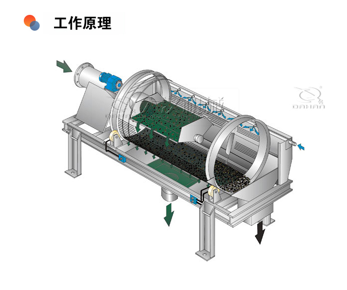 滚筒筛主要由电机、减速机、滚筒装置、机架、密封盖、进料口、出料口等部分组成。滚筒装置倾斜安装于机架上。电动机经减速机与滚筒装置通过联轴器连接在一起,驱动滚筒装置绕其轴线转动。当物料进入滚筒装置后,由于滚筒装置的倾斜与转动,使筛面上的物料翻转与滚动,使合格物料(筛下产品)经滚筒后端底部的出料口排出,不合格的物料(筛上产品)经滚筒尾部的排料口排出。由于物料在滚筒内的翻转、滚动,使卡在筛孔中的物料可被弹出,防止筛孔堵塞。