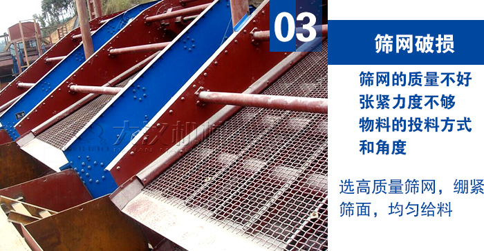 解决方法:① 需要选择高质量的圆振动是啊筛网。② 在安装筛面时,需要尽量将筛面绷紧。③ 均匀给料,控制给料速度。